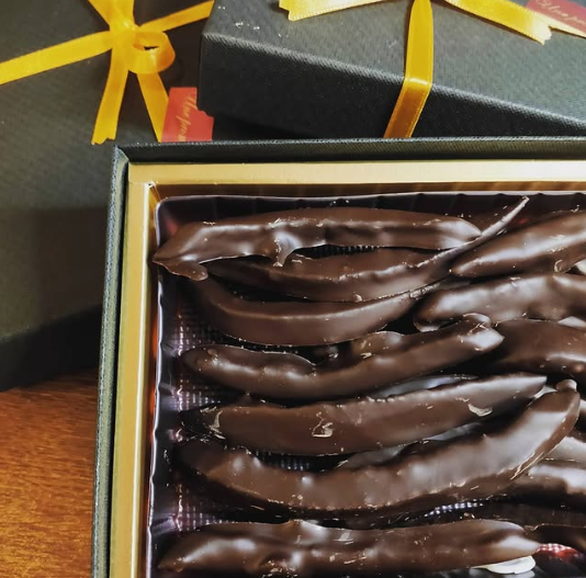 じっくりと時間をかけてシロップに漬け込まれたオレンジピールの爽やかな香りと、力強いカカオの風味が絶妙なハーモニーを奏でます。 皮のほろ苦さと、コーティングされたチョコレートの甘みが重なり合う瞬間は、まさに贅沢。一口ごとに香りが鼻を抜ける、素材の良さを最大限に引き出した逸品です。