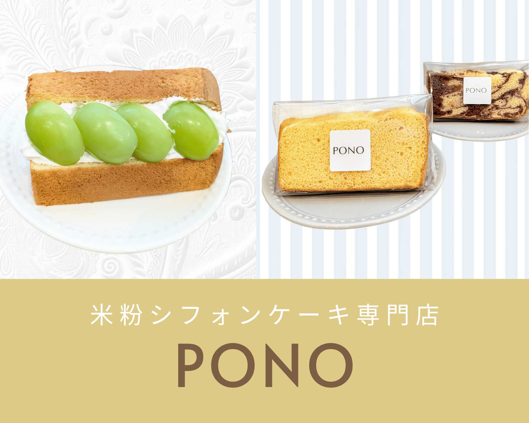 | 店舗紹介 | グルテンフリーの米粉シフォンケーキ専門店【PONO】です。小麦粉やベーキングパウダーを使わずしっとりふわふわに焼き上げました。小さなお子さまからご年配の方まで安心してお召し上がりいただるおやつです。 |