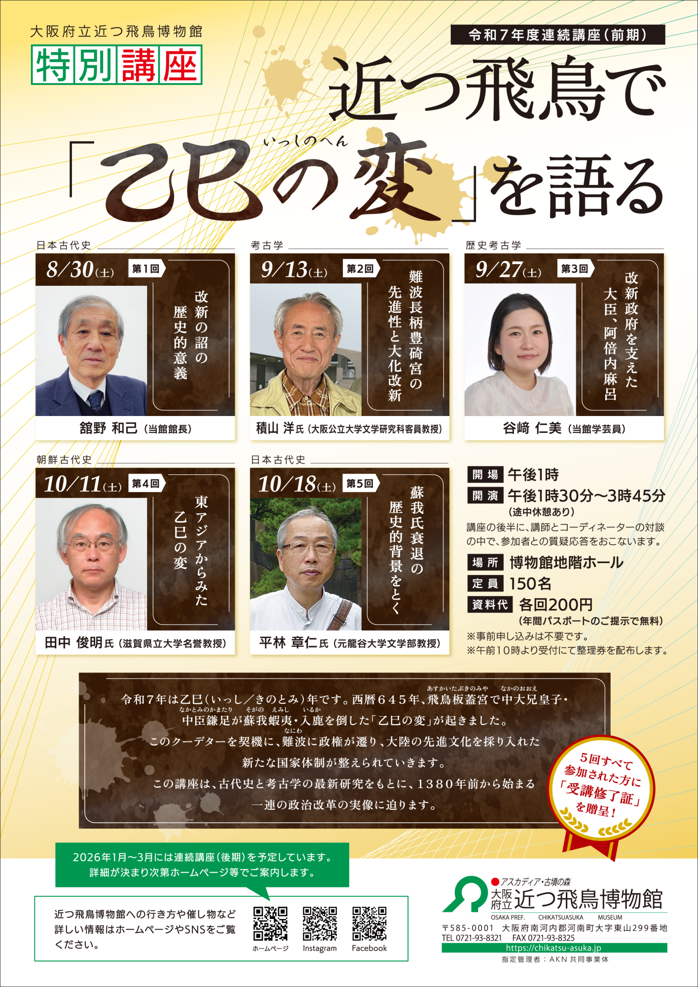 同館では、令和7年度連続講座(前期)として、歴史・考古・古代史の各分野の専門家を招いた特別講座「近つ飛鳥で『乙巳(いっし)の変』を語る」も開催されています。