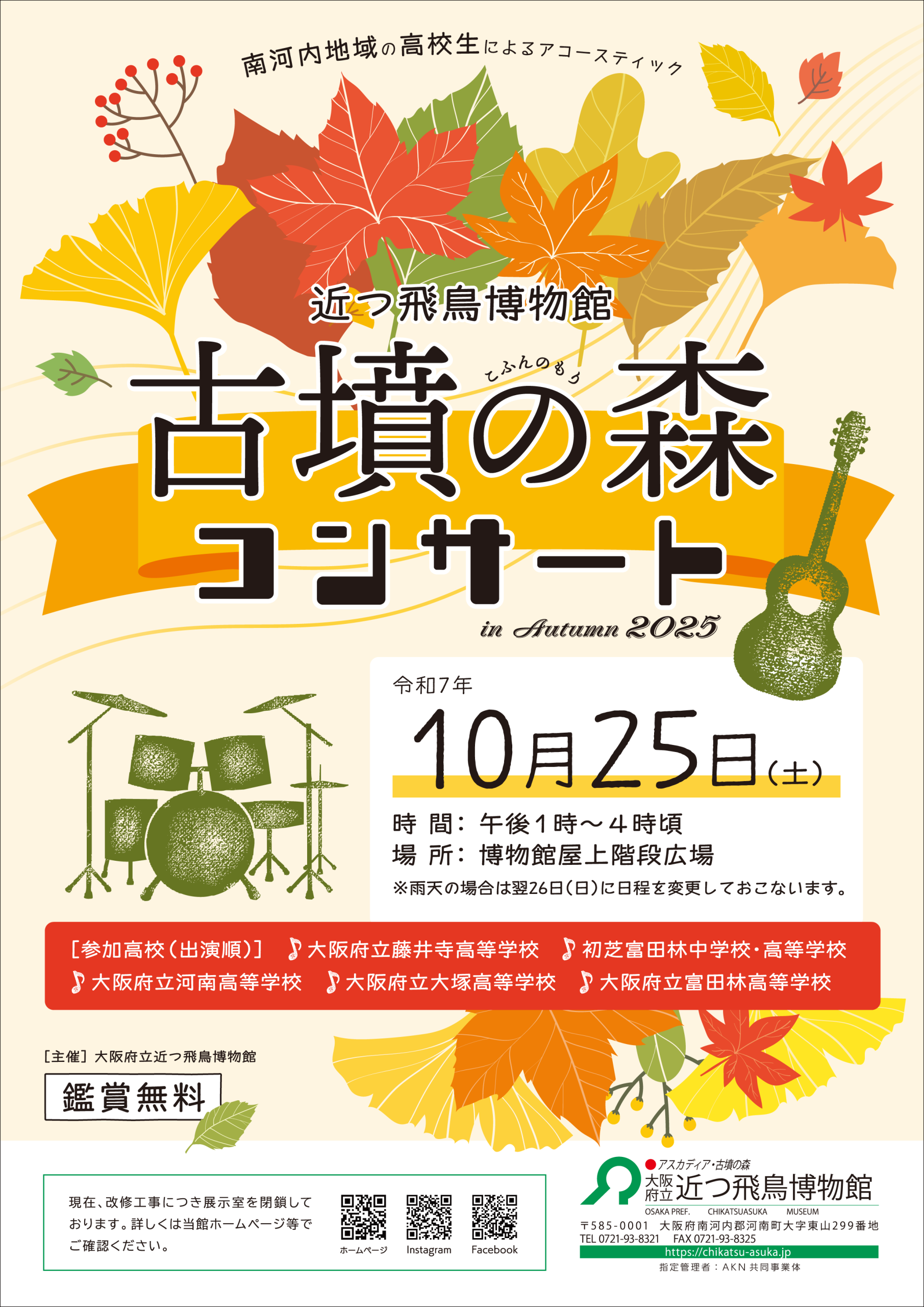 10月25日(土)午後1時から4時頃にかけて、博物館屋上階段広場で開催される「古墳の森コンサート」は、南河内地域の高校生によるアコースティック演奏イベントです。秋の空の下、緑豊かな古墳の森を背景に、若い感性が奏でる音楽が響き渡ります。