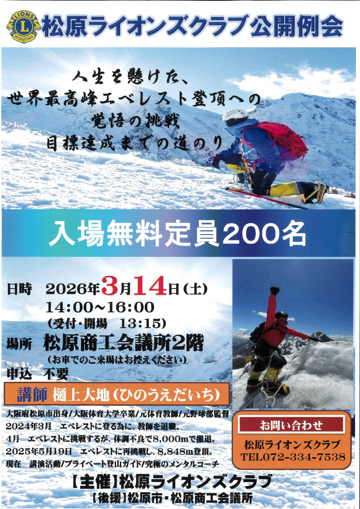 松原ライオンズクラブによる公開例会が、2026年3月14日(土)に開催されます。今回のテーマは「人生を懸けた、世界最高峰エベレスト登頂への覚悟の挑戦 目標達成までの道のり」