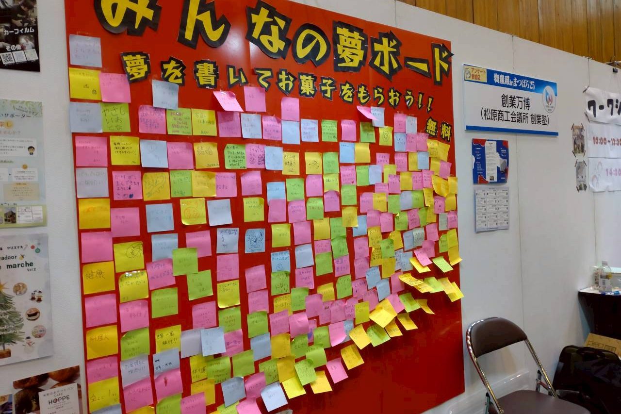 創業塾から参加された皆さんが力を合わせて出店した「企業塾合同ブース」では、出店者同士の活気あふれる連携が印象的でした。来場者の方々と直接お話を伺う中で、「意外に盛り上がってるなと思った」「松原盛り上げます!」と力強いメッセージもいただき、地域を盛り上げたいという想いがしっかりと伝わってきました。来場者の方にはみんなの夢ボードをたくさん書いてもらいました!