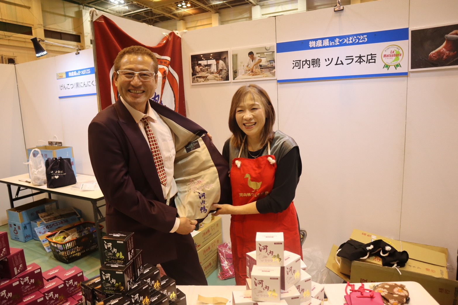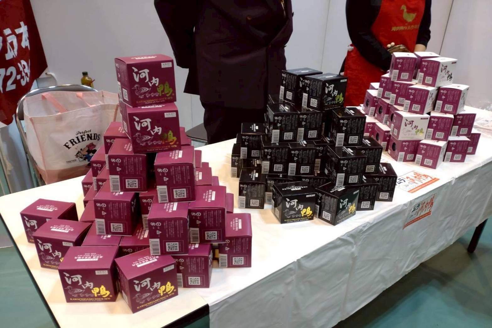 農林水産大臣賞を目指して開発された新商品、世界で唯一お刺身で食べられる鴨の常温販売ブースです。