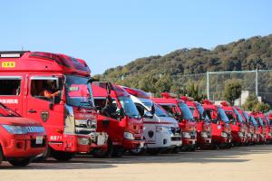 富田林市消防団や大阪南消防組合の消防車両が勢ぞろい!自主防災組織の皆さんも参加し、分列入場行進や一斉放水訓練をご覧いただけます。