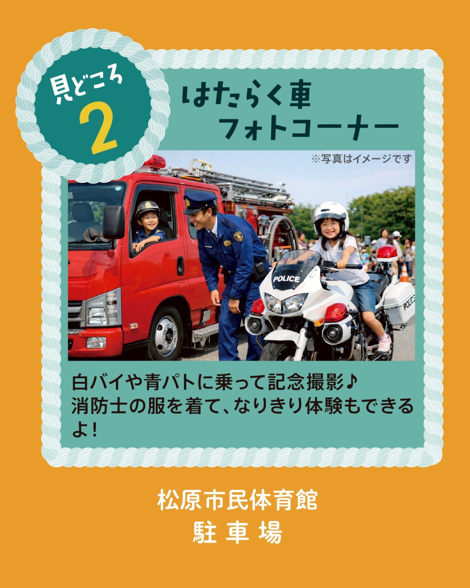 🔸白バイや青パト、自衛隊の車両に乗って記念写真が撮れるはたらく車フォトコーナー(駐車場)